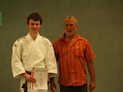 Nach einem anstrengenden Vormittag hat er die Urkunde in Empfang nehmen dürfen, die ihn berechtigt ab jetzt den schwarzen Gürtel zu tragen. Herzlichen Glückwunsch.