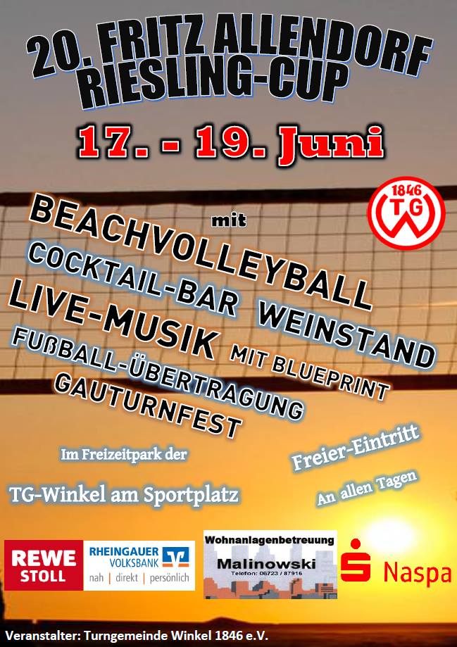 Vom 17. - 19. Juni 2016 wird der 20. Allendorf-Riesling-Cup, ausgerichtet von der TG Winkel, unter der Schirmherrschaft der European Beach Foundation ausgetragen.