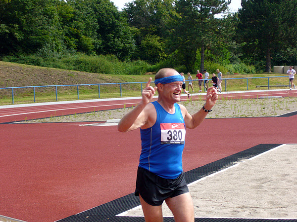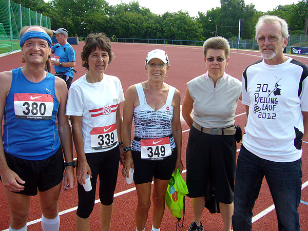 Die HM-Läufer mussten nach dem ersten (identischen) Streckenabschnitt eine Runde auf der Bahn absolvieren, bevor es wieder "in die Weinberge" ging. Hier kam dann Martina Schmid als Erste wieder ins Ziel. Sie lief in 1:54:46 std. auf Platz 4 in der AK W50. Christel Schredelseker gewann ihre AK W60 in 1:58:41 std. Bis hierhin waren die Lauftreffler alle etwas langsamer als noch im Vorjahr, aber Christoph Britz konnte sich dann darüber freuen, dass er mit 1:58:01 std. das erste Mal beim Rieslinglauf-HM unter der 2-Stunden-Marke blieb. Den HM absolvierten 185 Läuferinnen und Läufer, eine tolle Zahl! Insgesamt freuten sich die Lauftreffler über gute Platzierungen und / oder Zeiten und genossen anschließend noch gemeinsam das Kuchenbuffet und / oder die Bratwurst sowie die Siegerehrungen. Der Ausrichter hatte - natürlich - den Lauf wieder toll organisiert, unterstützt von vielen Helfern und Vereinen. Und nach dem 25er-Jubiläums-Shirt gab es diesmal noch eine Steigerung mit dem 30er-Laufshirt! Glückwunsch an die Aktiven und ganz herzlichen Dank (verbunden mit einem "weiter so in 2013) an das Team um Heinz-Michael Becker und Dieter Urbach!!