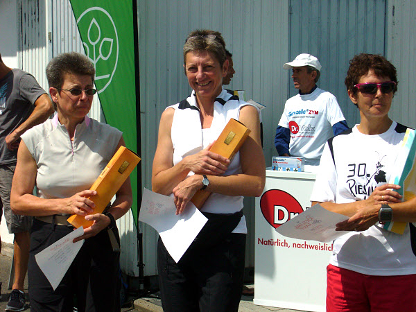 Wie bereits einige andere Veranstaltungen feierte auch der von der TG Mittelheim ausgerichtete RIESLINGLAUF in diesem Jahr Jubiläum: die "klassische" 10 km-Distanz gab es schon zum 30. Mal, und der HM fand nun auch schon zum 5. Mal statt. In den Ergebnislisten finden sich einige TGWler vom Lauftreff: Martina Schmid, Christel Schredelseker und Christoph Britz im Halbmarathon sowie Heike Charissé und Achim Heuer im 10 km-Lauf. Regen in der Nacht zuvor, Regen auch noch mal um 8:00 Uhr morgens, aber dann hielt das Wetter und die Temperaturen hatten ein angenehmes Niveau erreicht. Nachdem der Schülerlauf auf der schnellen Bahn abgeschlossen war, gingen die Läuferinnen und Läufer kurz nach 9:00 Uhr an den Start, in diesem Jahr erstmals mit einem Chip für die elektronische Zeitmessung ausgestattet. Die Strecke war wie gewohnt gut zu laufen, und als Erster der TGWler erreichte Achim Heuer nach (nicht ganz so guten) 46:39 min wieder das Ziel. Damit belegte er den zweiten Platz in der AK M55 und den 26. Gesamtplatz (von 147). Heike Charissé erreichte mit ihrer Zeit von 56:24 min den dritten Platz in der AK W50.