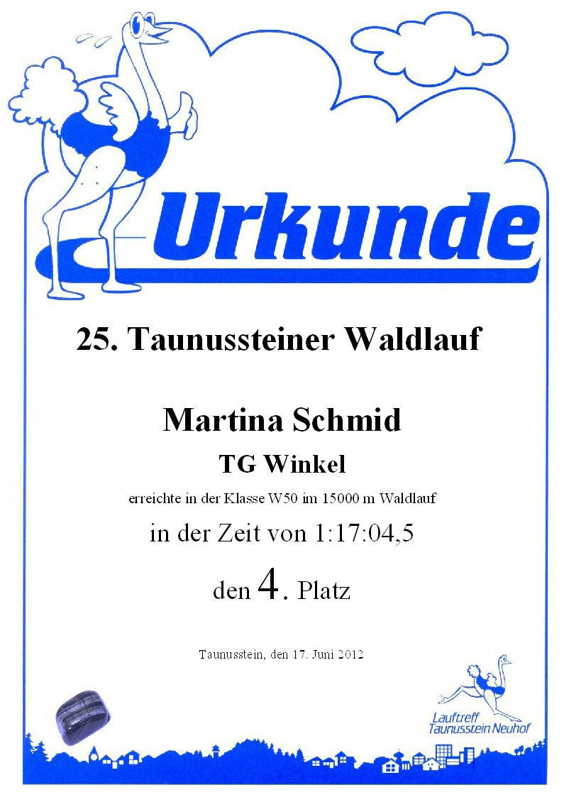 Am letzten Sonntag, dem 17. Juni 2012, fand der Taunussteiner Waldlauf bereits zum 25. Mal statt. Für die TGW waren erfolgreich am Start: Martina Schmid und Hans Fittler.