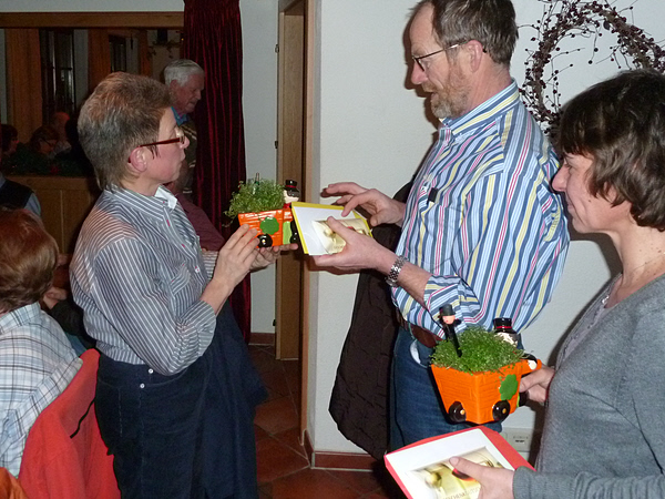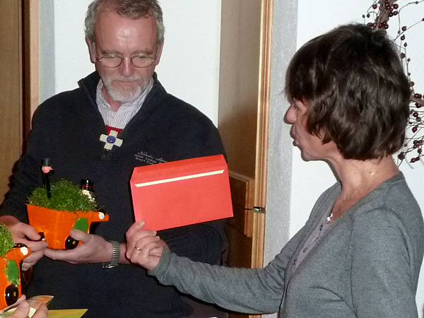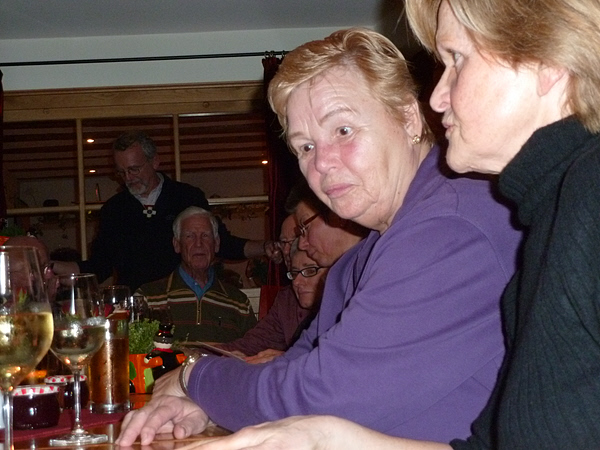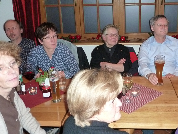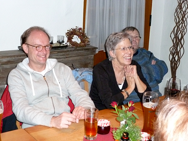 Mehr als 20 Sportlerinnen und Sportler brachen nach einem kleinen Begrüßungsschluck auf, um den Abend im Wingertsknorzen fortzusetzen. Das Lauftreff-Leitungs-Team (LTLT) dankte den Teilnehmenden an vielen Übungsabenden des vergangenen Jahres mit einem kleinen Gläschen Weingelee (aus den Trauben von Achims einzigem Weinstock!). Nur ein kurzer Rückblick auf ein verletzugnsfrei absolviertes 2012, verbunden mit der Hoffnung auf ein ebenso erfolgreiches 2013, und dann "schlugen" die Läufer und Walker sozusagen zurück: Es gab eine Vielzahl von Geschenken für das LTLT, für die wir uns noch einmal ganz herzlich bedanken möchten. Unsere (ehemalige) Traudel hatte durch Erich Pralinen überbringen lassen, die schnell reißenden Absatz fanden. Auch Willi B., der sich - um mit Hans` Worten zu sprechen - von seinem "Gold-Polterabend" kurzzeitig hatte lösen können, gab uns die Ehre. Bei Speis und Trank, vielen Erzählungen und mit guter Laune fand der Abend seinen späten Abschluss. Für den nächsten Donnerstag hatte das LTLT (klingt gut, oder?) dann aber auch gleich noch eine "Drohung" parat: Es wird wieder sportlich zugehen !! Bis dahin also !
