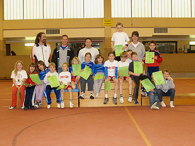 Mit 19 Athleten fuhren die Eltern und Trainer der TG Winkel am Sonntag nach Wiesbaden zum Hallenkinderturnfest der Turnerjugend. In getrennten Hallen traten die Kinder zu ihren Gerätturnen- und Leichtathletikwettkämpfen an. Die Kinder in der Leichtathletik-Halle absolvierten einen Dreikampf (50m-Sprint, Weitsprung, Ballwurf) und die Turner einen Geräte-Vierkampf (Boden, Barren/Reck, Sprung, Balken). Es war auch möglich, einen gemischten Sechskampf zu bestreiten (je 3 Disziplinen Leichtathletik bzw. Turnen). Die Wettkämpfe wurden durch die Hilfe der Eltern und Betreuer recht zügig durchgeführt und auch auf die Siegerehrung mussten alle nicht lange warten! Die Athleten der Turngemeinde Winkel schnitten erfolgreich ab, fünf Kinder siegten in ihrem Wettkampf: Karsten Brudy, Frithjof Lemke, Noria Brecher, Julia und Katharina Luckmann, aber auch alle anderen Platzierungen waren hervorragend!